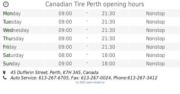 It is also possible to : Edit these OPENING HOURS of Store Canadian Tire In Perth, 45 Dufferin Street,